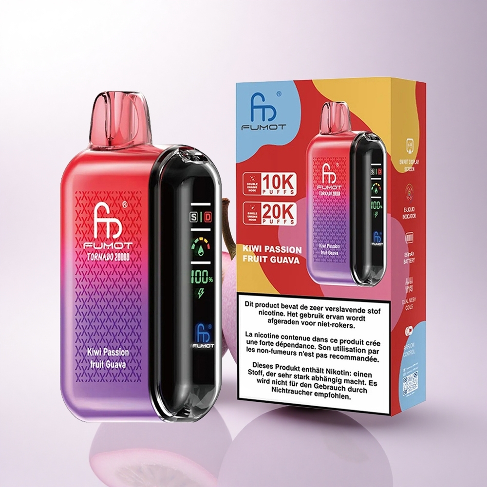 Fumot Tornado 20000 Puffs جوافة فاكهة العاطفة الكيوي مع شحن 850 مللي أمبير ومراقبة الهواء الذكية