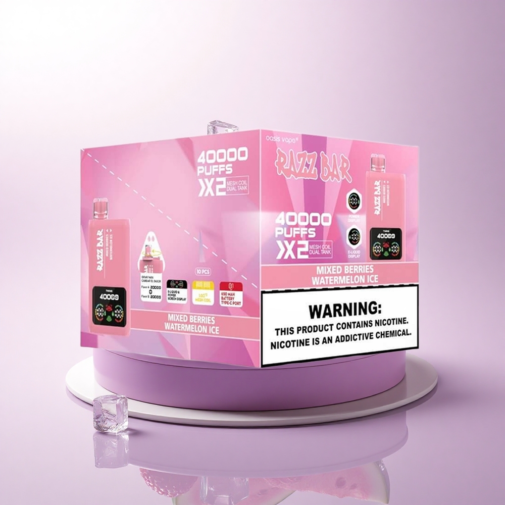 Razz Bar 40000 Puffs توت مختلط - آيس بطيخ مع شاشة عرض وملف شبكي 1.0 أوم ومحتوى نيكوتين 2%